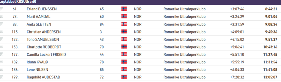 Marit Aamdal løp inn til en strålende 10.plass blant kvinnene og var godt fornøyd med løpet. Hun skriver: Good to be back! KRS er aldri en walk in the park, og kommer alltid litt brått på. God opplevelse tross tøffe forhold, med gjørmefest og stedvis snøføre på sjukt glatte og tunge, tekniske stier. Vassing i iskalde myrer, herlige og uendelige ikke-løpbare kneiker opp og ned. Litt regn og litt sol, varmt og kaldt. Hvitveisen har kommet! Trivelig gjensyn med mange fra ultrafamilien. Ble sliten, de siste ti er alltid seige. Fantastiske matstasjoner og crew, og ekstremt godt merket. Så takknemlig! Kom i mål etter 9t 1min og logget 62 km/2400 hm, cirka et kvarter raskere enn i 2022 (da stiene var betraktelig tørrere).